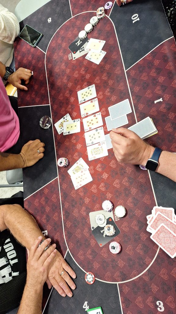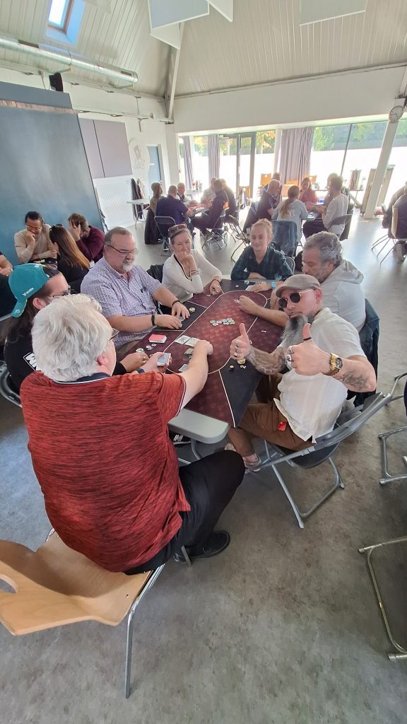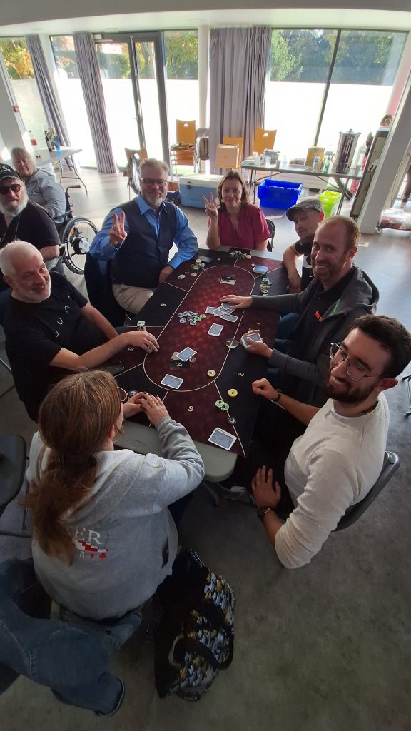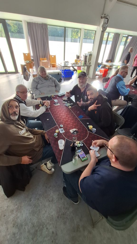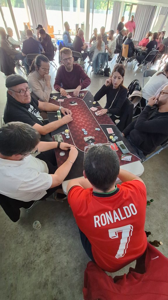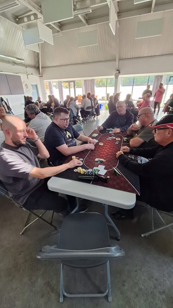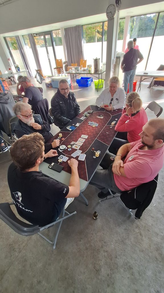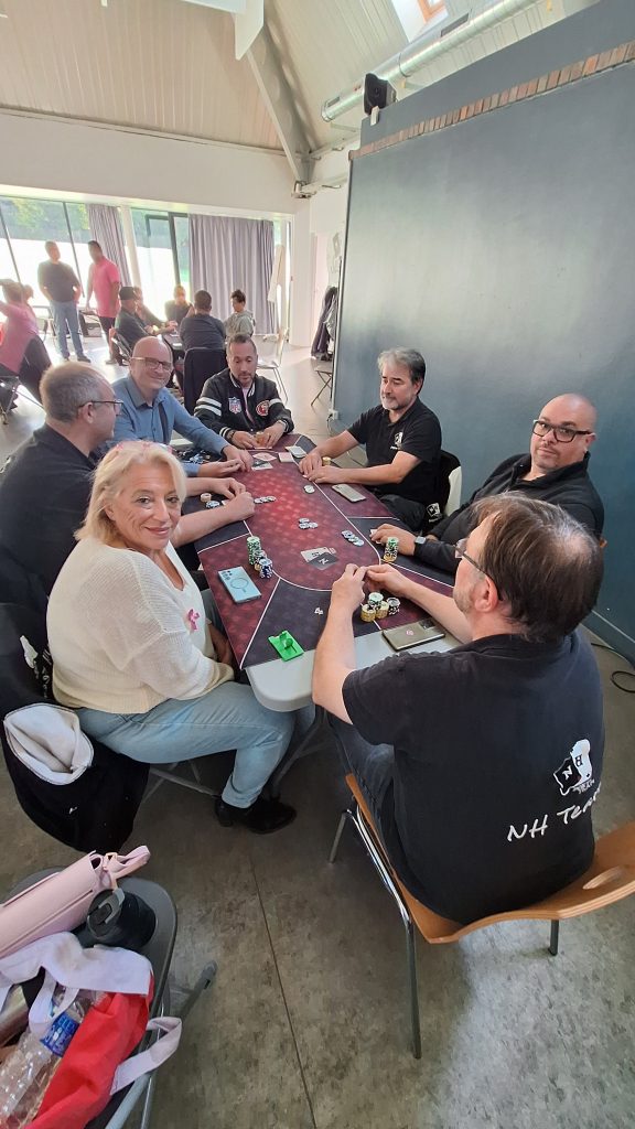 Les adhérents aident au placement des tables de poker avant le « shuffle and deal » où vont s’affronter les 53 joueurs inscrits, dont la présence du premier club invité « VDA Poker » avec 5 de ses adhérents.