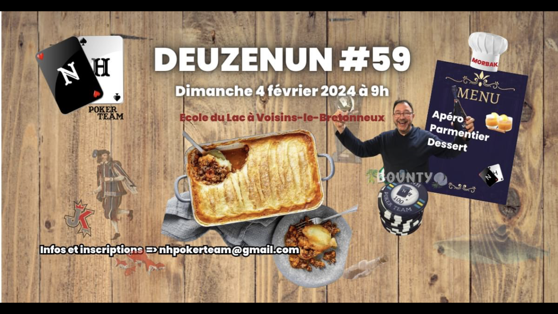 Bonjour à tous, L’équipe du NH Poker Team vous donne rendez-vous dimanche 04 février 2024 à partir de 9h au réfectoire de l’école du Lac de Voisins-le-Bretonneux pour son tournoi mensuel de février, soit le DzU#59 (démarrage du tournoi à 9h30). Nous aurons le plaisir d’accueillir le club des Valets du Roi et de féliciter Jean-Luc qui remplira pour notre plus grand plaisir son…Read More
